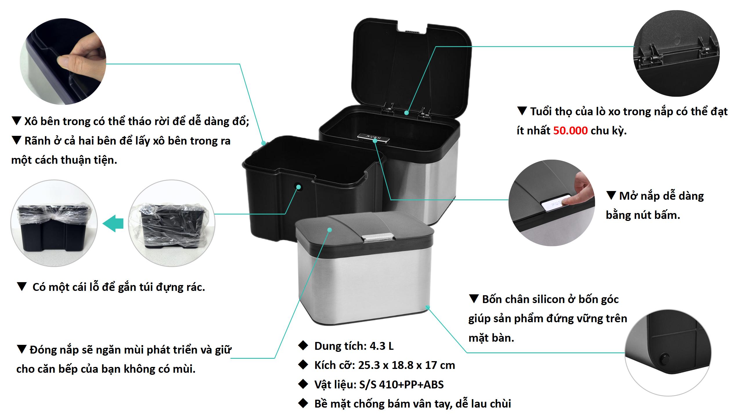 Thùng rác inox nhấn vuông phủ Nano Cao Cấp 4.3L