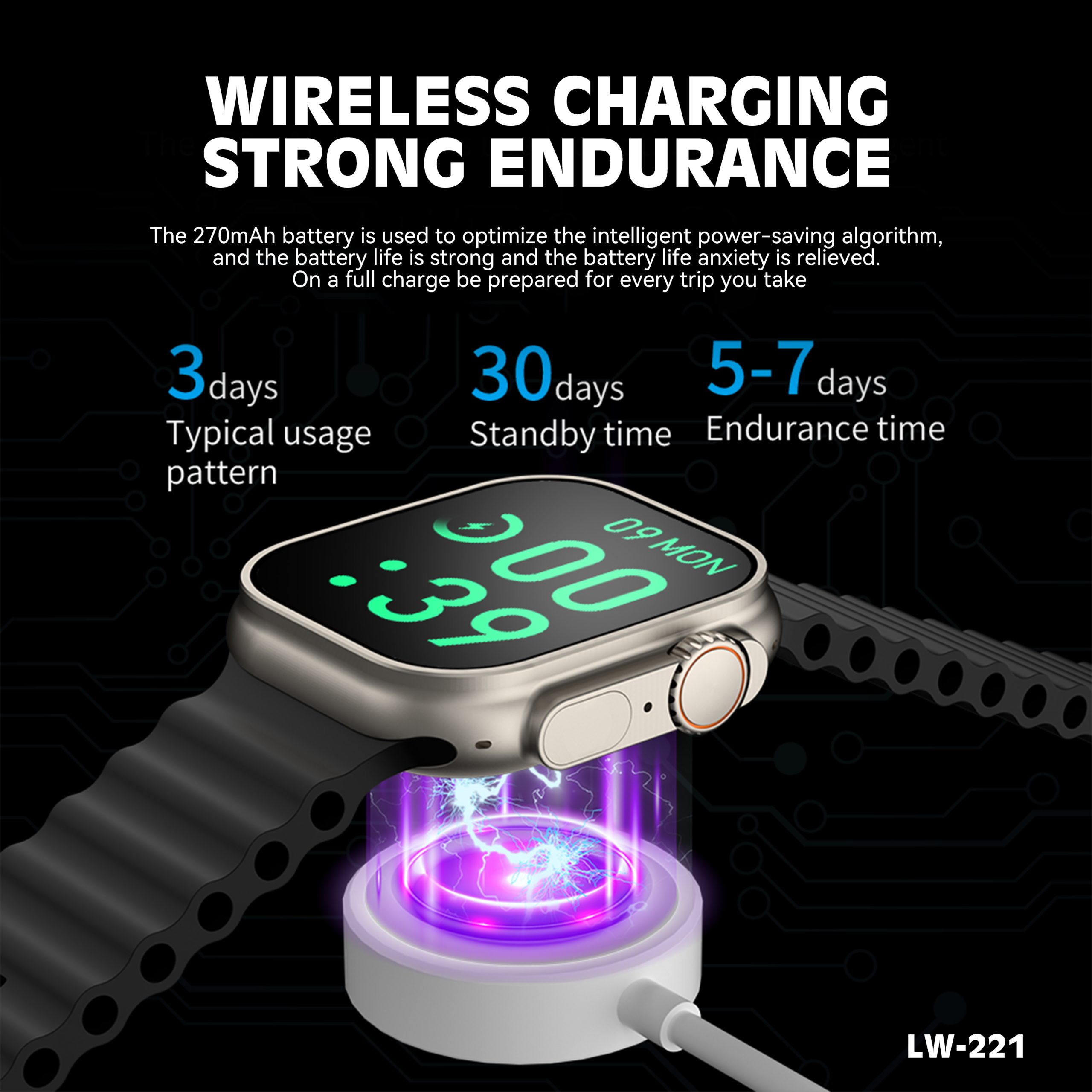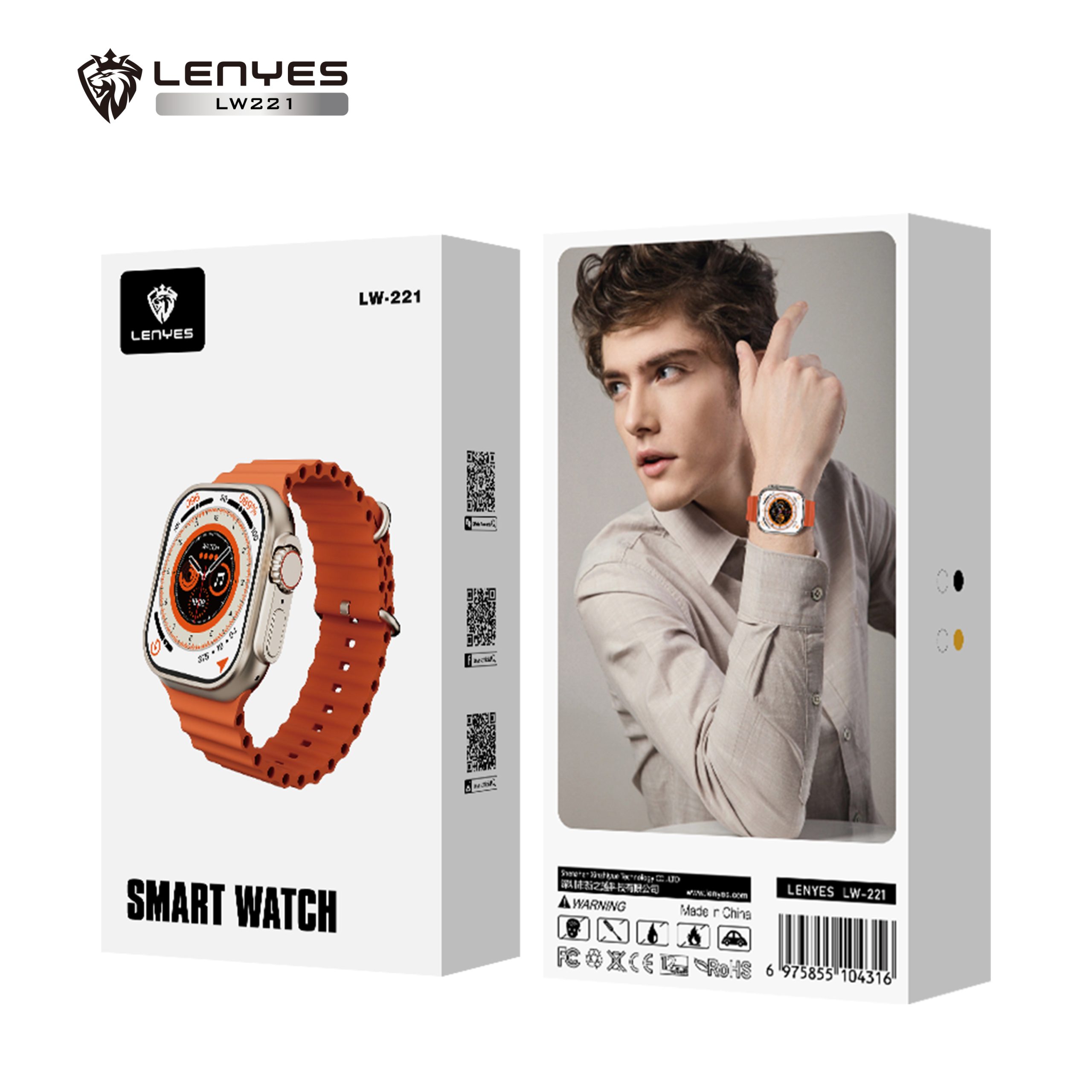 ENYES LW-221 ULTRA 1.Memory: 128M 2.Standby time: about 3 days of regular state use 3.Display: 2.02-inch full lamination universal clear 240 * 29 6 4.Waterproof: life waterproof 5.Bluetooth: BT5.1 6.Touch:Full Touch Screen OGS Touch IC:CST816D 7.Support version:Android 5.0 and above and IOS8.0 and above 8.CHARGING METHOD: Wireless charging 9.APP: HIWATCH PLUS 10.Functions: Support Bluetooth call, pedometer, exercise steps, exercise mileage log, calories burned, multi-sport mode, true rate, true blood pressure, games, voice assistant, sleep monitoring, sedentary reminder, incoming call reminder, message reminder, stopwatch, music control and playback, photo control, frequently contacted people, call logs, bluetooth call, manually customize the time…
