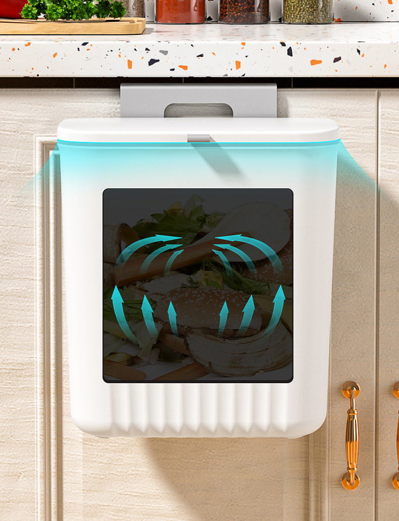 Thiết kế thông minh, treo trên cánh tủ kệ bếp và không ảnh hưởng tới việc đóng mở cửa tủ. Vứt rác không cần khom lưng, các chất bẩn không rớt lênh láng khắp nơi, khi quét lau sàn nhà không bị vướng víu.