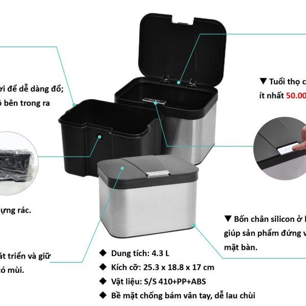 Thùng rác inox nhấn vuông phủ Nano Cao Cấp 4.3L